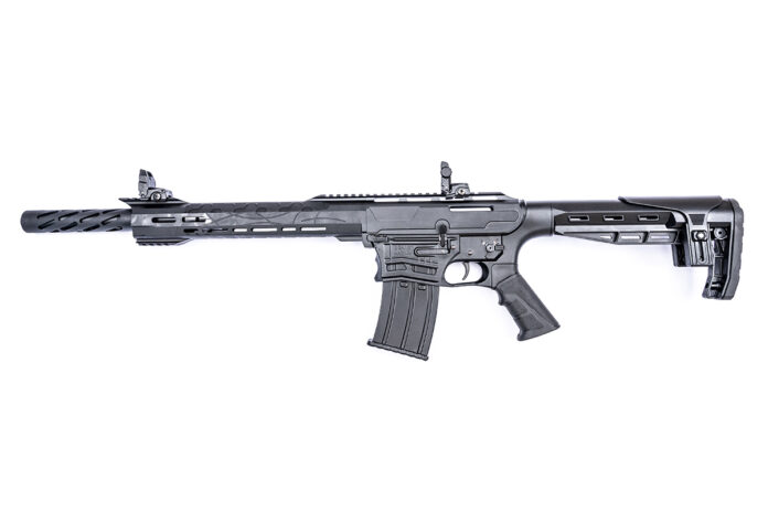 People either tend to love AR-style shotguns or hate them. The biggest complaint inevitably is the magazine. 12-gauge AR style magazines do not load quickly. They take a little practice and technique. But if you have several of them loaded, switching them out is super-fast. I loved the ergonomics of this gun because I shoot a lot of AR-15s. We had a few times when the gun failed to go fully into battery. This may be a “breaking in” period, and other reviews mention the gun needing a good cleaning and sticking to high-velocity shells to make it cycle. However, for less than $400, this gun came with a lot of features. The spring-loaded, folding sights were similar to Magpul. An adjustable cheek riser, M-LOK compatible forend and a Picatinny rail for optics all come standard.