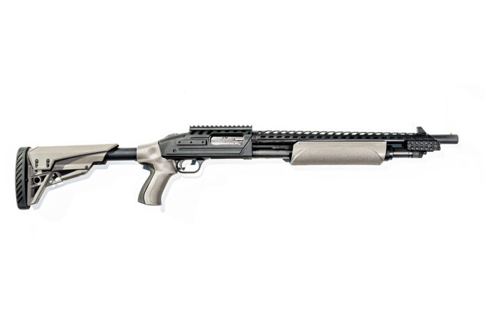 Mossberg’s staple pump 12-gauge shotgun, the model 500, has been riding in police cruisers and serving as a home-defense gun for more than 50 years. The ATI (American Tactical Incorporated) model provides some new furniture to increase the functionality of this tried and true classic. The six-position telescoping stock is ATI’s TactLite and it is fitted with the company’s Scorpion butt pad. Length of pull can be adjusted from 10.75 inches to 14.62 inches. ATI’s Halo side saddle is bolted to the top of the receiver and provides nine mounting points for shell holders. Nine removable shell holders are also included. The ATI Halo Heatshield provides a blade front sight, and a notch in the receiver-mounted Picatinny acts as a rear sight. At the front of the heat shield are two 2.5-inch Picatinny rails for lights or lasers.