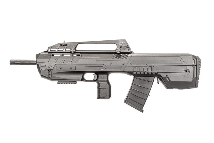 Our last shotgun was the HALO Battle Rifle—I mean the Compact Tactical, but it looks just like the HALO BR. It is a semi-automatic, gas-operated, magazine-fed bullpup with an AK-style safety. Basically, it is a clone of a Saiga 12 gauge dropped into a bullpup chassis. It feels solid despite being primarily made of polymer. It has peep sights on the carry handle, but that can be removed, and Magpul-style flip-up sights are also included. The trigger leaves a lot to be desired, but this is a combat weapon, not a sniper rifle. It also comes with a forward vertical grip, but we didn’t put it on during testing; it handled great without it. It can load from a closed bolt, but it is difficult. A small button under the safety locks the bolt to the rear and makes it much easier to load. The biggest complaint was the rearward location of the safety. But the coolness factor had everyone saying, “Yes sir, I need a weapon.”